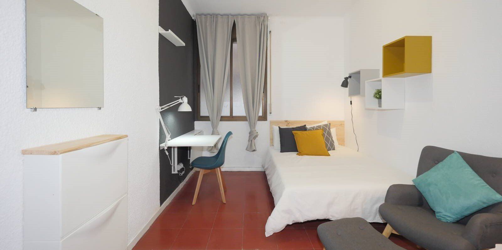Esta magnífica habitación, en este piso tan encantador, es todo lo que necesitas para disfrutar de tu estancia en Barcelona. La habitación cuenta con una zona de descanso con cama doble, una zona de estudio con escritorio, y una zona de almacenamiento con un armario para guardar todas tus pertenencias. Además, la habitación está equipada con ventilador y radiador, con los que podrás mantener la temperatura de la habitación a tu gusto. Además, también podrás acceder a todas las demás zonas comunes de las que dispone este piso. Esta habitación tiene todo lo necesario para tu estancia en Barcelona y es perfecta para estudiantes o jóvenes profesionales.