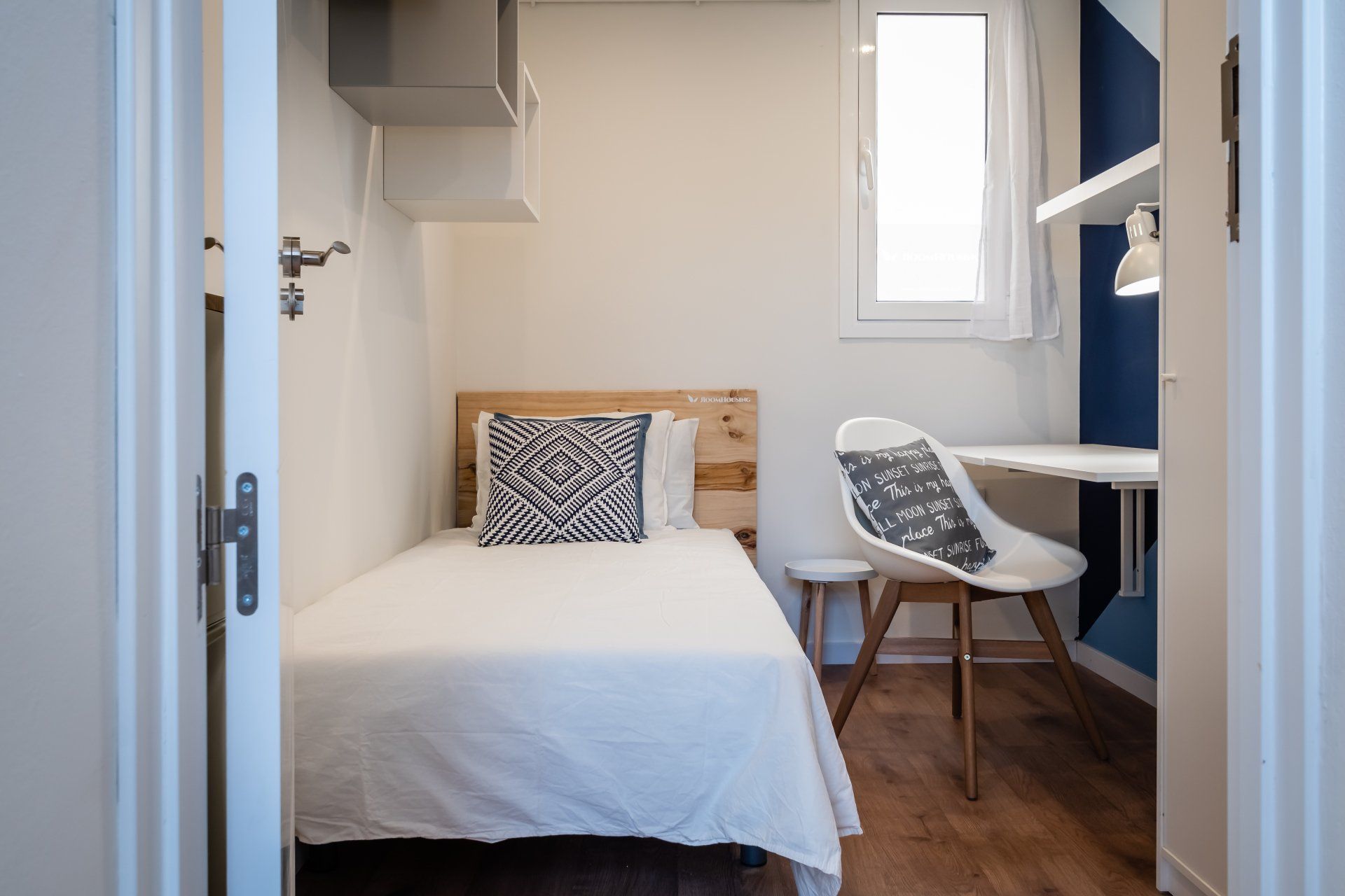 You are going to love this medium and practical room! It is extra bright and with a unique, compact, modern and functional design with everything you need in your room. It is decorated with light tones and a wine-colored wall which gives it an exquisite and sophisticated contrast, ideal for lovers of a good decoration in their own space. The room has a comfortable single bed with bedding, some shelves, a mirror, a shoe rack, a single folding desk with a study lamp, a chair and a wardrobe.