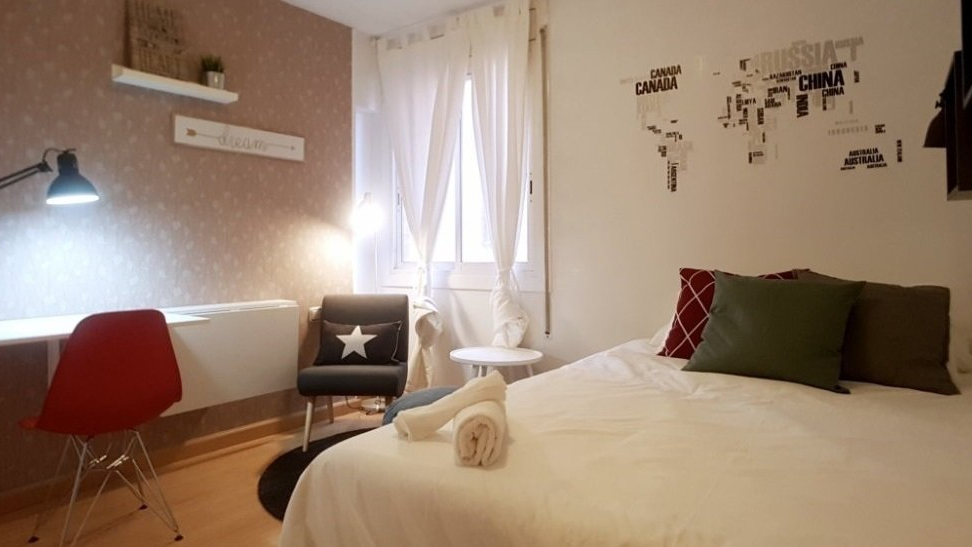 Esta tranquila habitación, es súper espaciosa, muy bonita y también luminosa. Con un diseño fantástico entre nórdico y moderno; se encuentra en la parte interior del piso, lo cual la hace más tranquila y puedas disfrutar al máximo de la tranquilidad de tu propio espacio para estudiar o trabajar. Lo genial de esta habitación es que tiene un gran armario, súper espacioso en el cual tendrás espacio de sobra para guardas todas tus cosas, además de tener una cama doble súper cómoda, estanterías, lámparas, escritorio doble abatible, una butaca, mesita y reposapiés, para esas tardes de relax, leyendo un libro o viendo tus series favoritas en la privacidad de tu habitación.