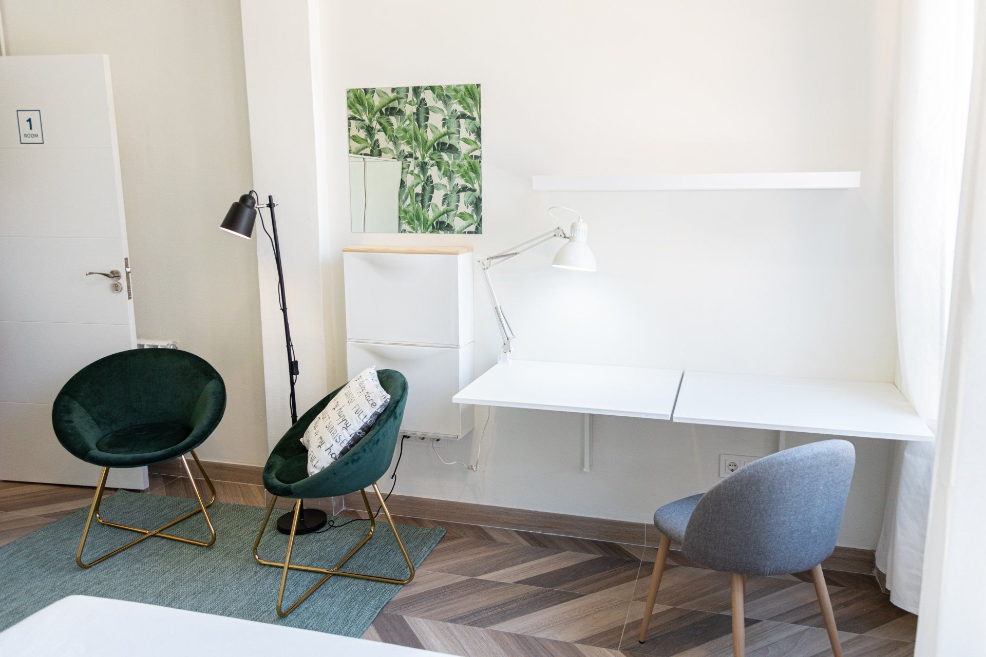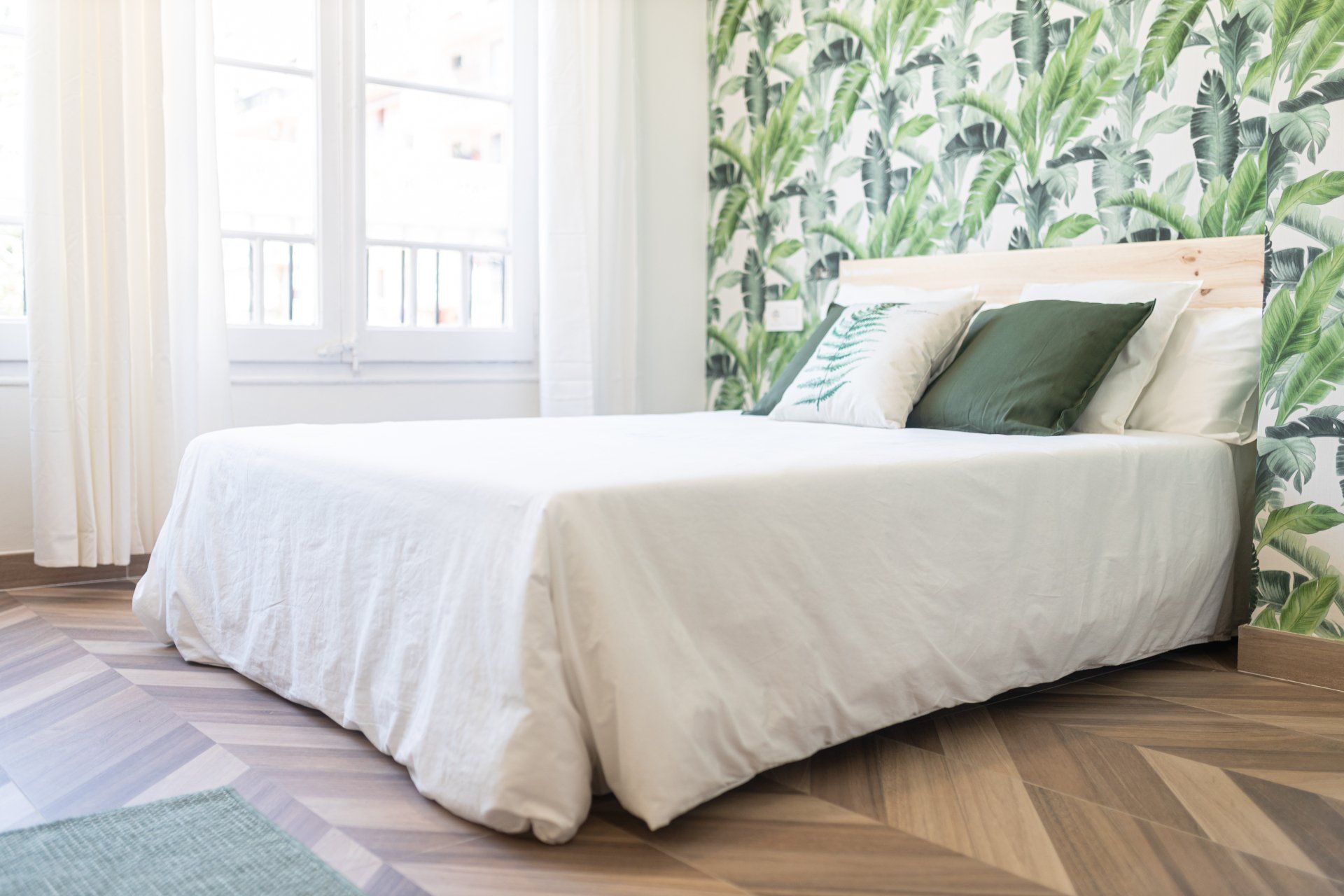 ¡Y esta es la guinda del pastel hablando de este fabuloso y super luminoso piso! Esta magnífica habitación es muy luminosa, espaciosa y preciosa, ya que todos los detalles y características hacen juego perfectamente para dejar como resultado un lugar muy chulo donde vivir, descansar o relajarte. El diseño y la decoración que tiene mezcla los estilos claros y salvajes a la misma vez haciendo un contraste con los tonos blancos y verde con los patrones botánicos, ¡simplemente fenomenal! Dispone de una cama doble equipada con sabana, nórdico, almohadas y cojines extra; además de un amplio armario, estanterías, dos butacas, lampara, escritorio doble abatible con lampara de estudio, silla de escritorio, espejo y zapatero.