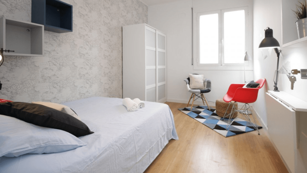 Si la tranquilidad a la hora de descansar es primordial para ti, pues sin duda esta opción es tu mejor alternativa. Esta preciosa habitación combina la tranquilidad de una habitación interior con lo luminosa de una exterior, ya que el piso se encuentra en la penúltima planta del edificio y por ello la ventana de esta habitación da hacia un patio interior de luces. El diseño espectacular y moderno que tiene le da ese toque juvenil y alegre que convertirá tu habitación en un lugar bonito donde acabar el día e iniciar uno nuevo. Dispone una cama doble la cual esta pensada para una mayor comodidad, equipada con ropa de cama, almohadas, un escritorio abatible con lampara de estudio, dos butacas con reposapiés, estanterías y armario.
