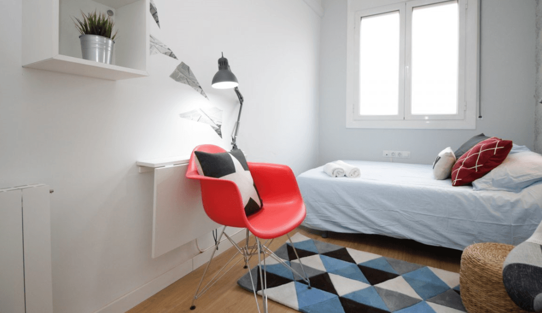 Esta increíble y estupenda habitación te dejara boquiabierto. El diseño fantástico con el que cuenta combina los colores claros con el estilo moderno de la decoración que tiene. Se trata de una habitación super chula y mejor aún, tranquila, para esas tardes, noches o fines de semana de relajo que tanto te mereces después de una jornada de trabajo o de estudio. Es bastante luminosa ya que el piso se encuentra en la penúltima planta así que tendrás una habitación luminosa durante el día y super tranquila de noche. Dispone de una cama doble con ropa de cama, almohadas y cojines extras pensado para la mejor comodidad para tu descanso; tiene también un escritorio abatible con lampara de estudio, dos butacas, un reposapiés, armario y estanterías.