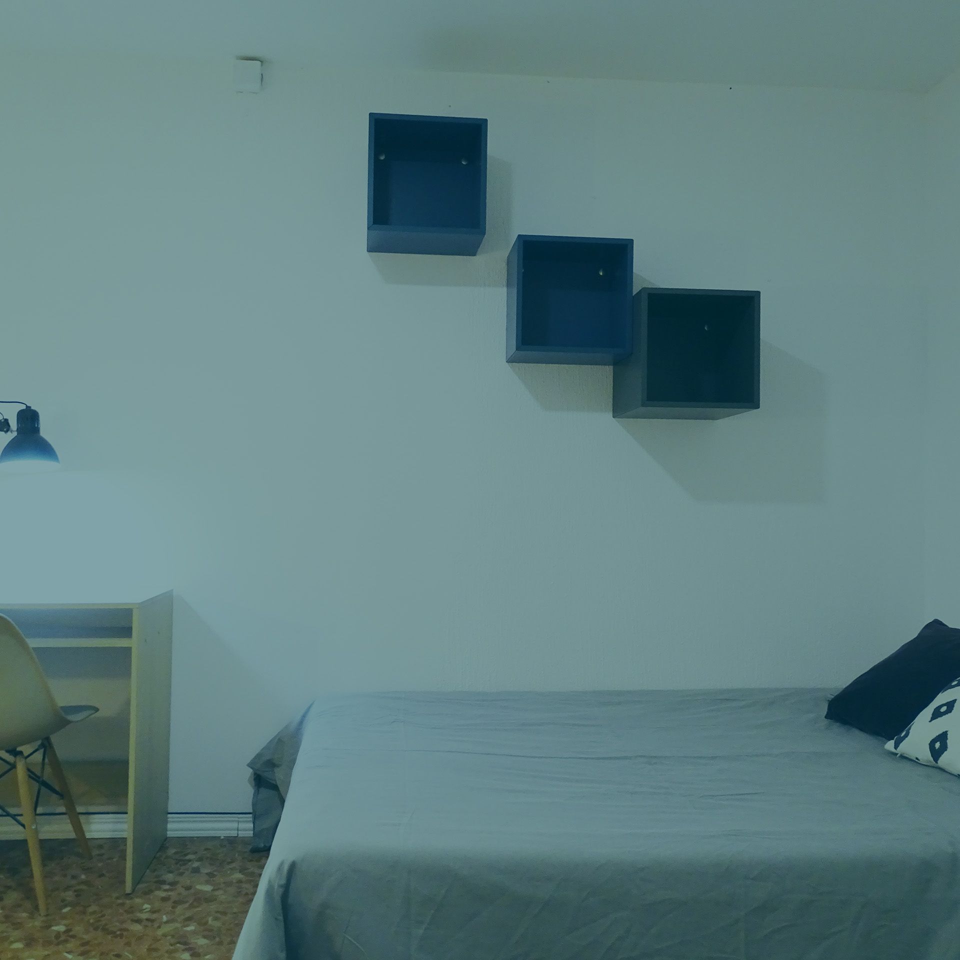¡Otra de nuestras mejores habitaciones sin duda! Esta preciosa y super amplia habitación es la joya de este fantástico piso, extragrande, super luminosa también. Tiene un diseño moderno y juvenil que combina los tonos claros con los toques verdes el cual llena la habitación de vitalidad y muy buena energía para comenzar el día. Lo mejor de esta habitación es que tiene un pequeño espacio que simula a una mini sala de estar dentro de la misma habitación, la cual tiene dos butacas confortables, un reposapiés y una lampara de sala. Dispone también de una cama doble pensada para una mayor comodidad con ropa de cama, además, un escritorio doble abatible con lampara de estudio y silla, estanterías, armario, espejo y zapatero.