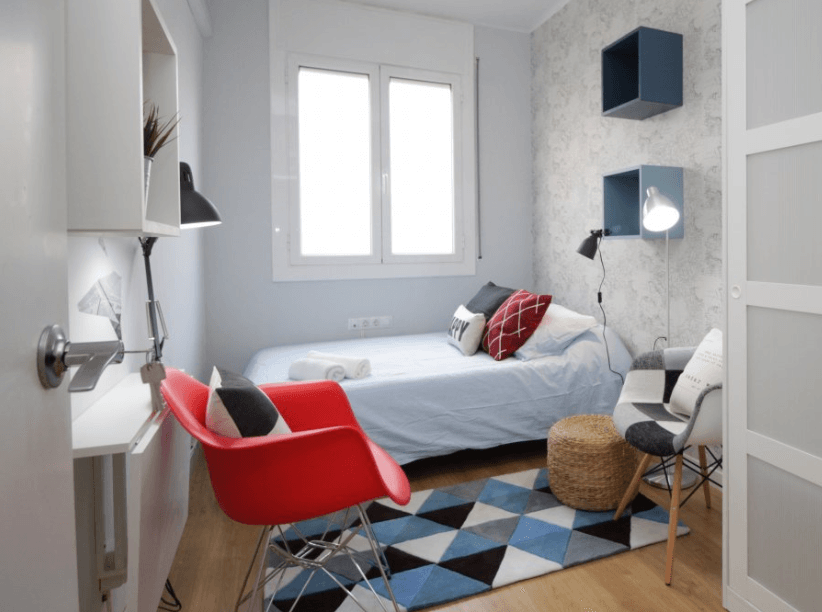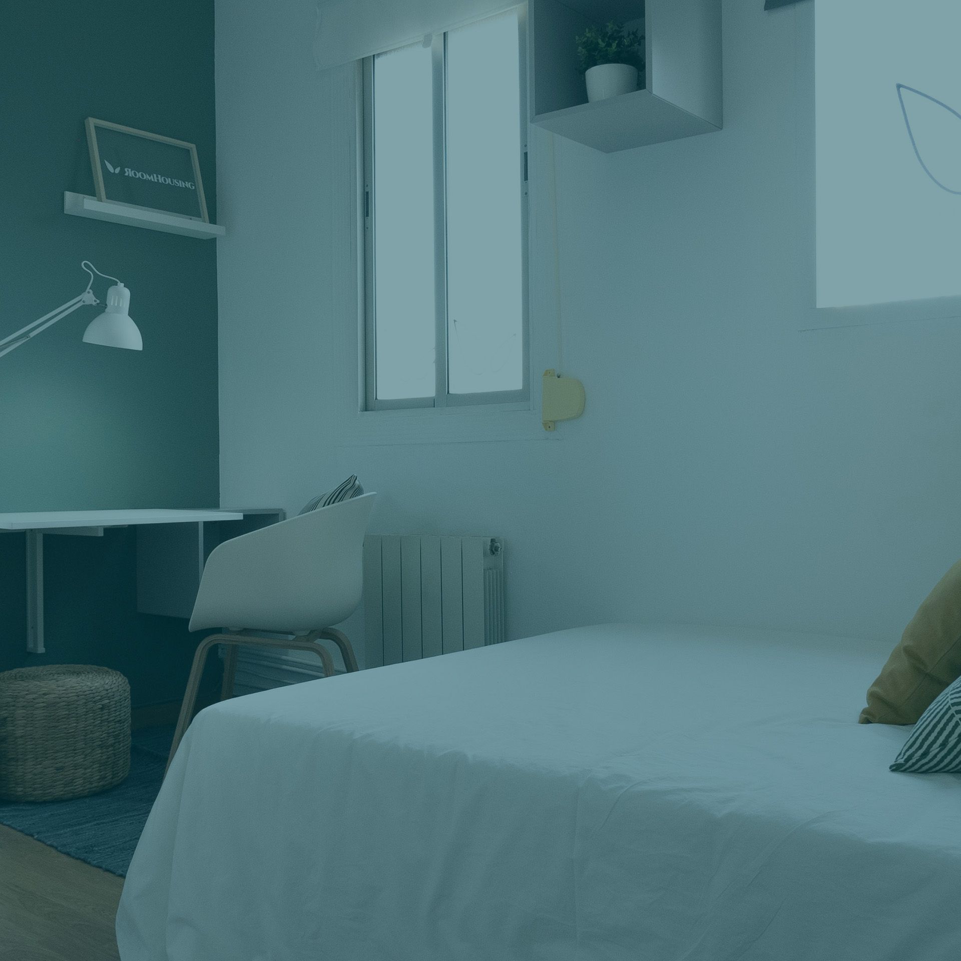 Esta preciosa habitación te encantará si lo que necesitas es una habitación interior y luminosa además de estar muy bien ubicada y en un piso fantástico y de diseño. Cuenta con una decoración moderna, fresca y juvenil, con detalles en tonos claros y verdes, lo que la hace perfecta para estudiantes y jóvenes profesionales. Esta habitación es acogedora, practica y tiene todo lo que necesitas en una habitación. Dispone de una cama doble super chula, equipada con sabana, nórdico, almohadas y cojines extras, todo ello pensado para una mayor comodidad; cuenta también con estanterías, una butaca con reposapiés, un escritorio doble abatible con lampara de estudio, silla y, además, un bonito armario.