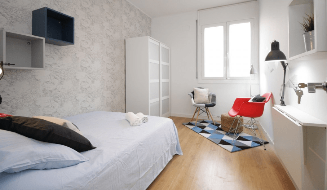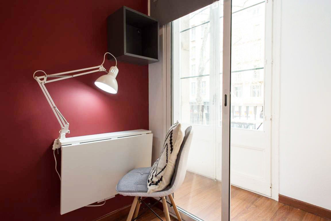 ¡Esta mediana y practica habitación te va a encantar! Es extra luminosa y con un diseño único, compacto, moderno y funcional con todo lo que necesitas dentro de tu habitación. Está decorada con tonos claros y una pared en color vino lo cual le da un contraste exquisito y sofisticado, ideal para amantes de un buen decorado en su propio espacio. Lo mejor de esta habitación es que es super luminosa y tiene acceso a una galería y balcón compartido con la habitación de al lado, donde podrás salir a tomar una taza de café, una birra y disfrutar de un precioso atardecer en la ciudad Condal. La habitación dispone de una cama doble confortable con ropa de cama, algunas estanterías, espejo, zapatero, un escritorio individual abatible con lampara de estudio, silla y armario.