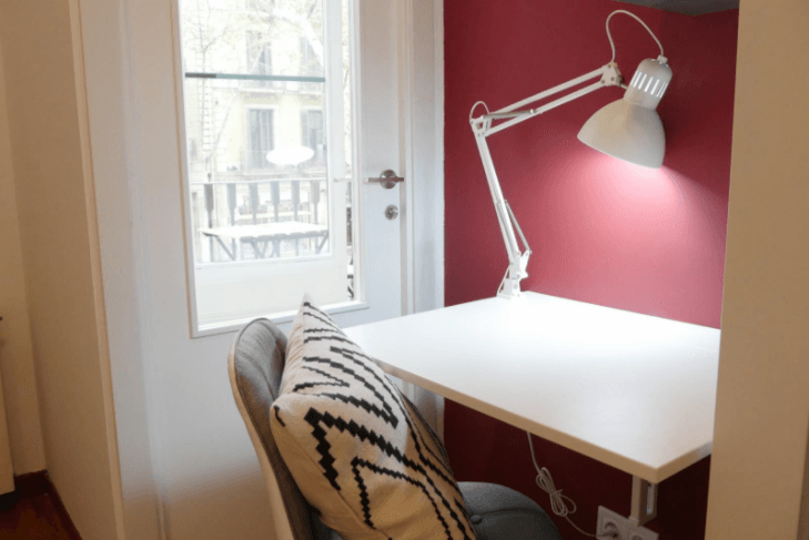Esta es una de nuestras habitaciones individuales mas bonitas de las que tenemos, muy luminosa y bien distribuida, equipada con todo lo que necesitas. Esta muy bien diseñada, para aprovechar cada espacio de la habitación. Lo mas guay de esta habitación es que es muy luminosa, ya que es una habitación exterior que tiene acceso a un balcón y galería que son compartidos solo con la habitación de al lado. ¡Y claro!, podrás salir al balcón que tiene una mesita con sillas a tomar un café, leer un libro o lo que prefieras. La habitación cuenta con una cama individual con sabana, nórdico, almohadas y cojines extras para un mayor confort, armario, estanterías, escritorio abatible con lampara de estudio, una silla, espejo y zapateros.