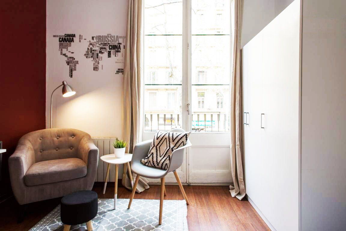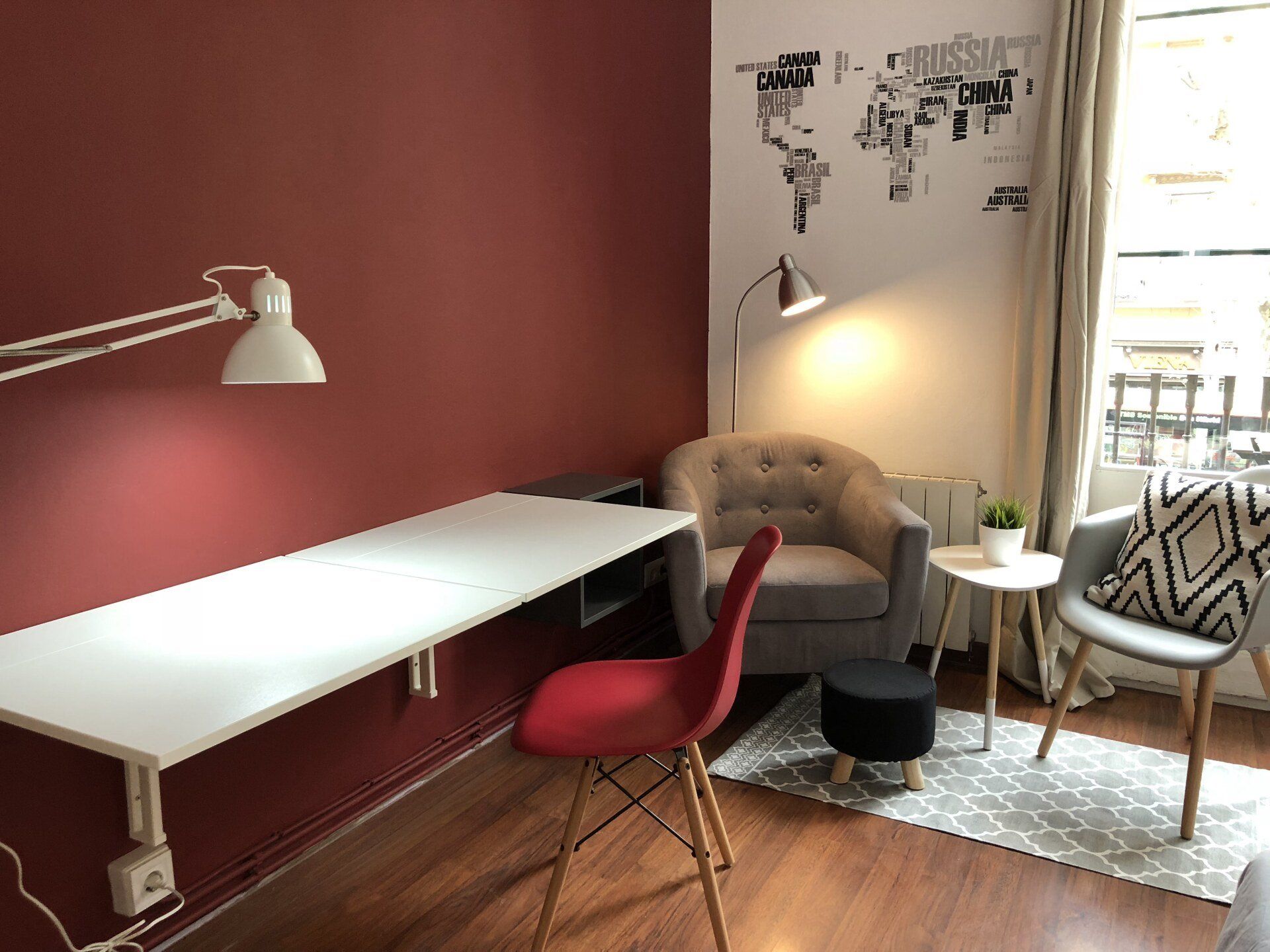 ¡La guinda del pastel de este piso la encuentras con esta habitación! Esta preciosa, amplia y super luminosa habitación es una maravilla que te dejara impresionado. El diseño con el que cuenta es espectacular, que mezcla tonos claros con un toque de color vino en una de las paredes, que resaltan con la luz natural que ingresa por la ventana que tiene acceso directo al balcón que da hacia la calle “Ronda de Sant Pere”, donde podrás salir cuando quieras a tomar un café, una birra, un refresco o simplemente disfrutar de un amanecer o atardecer. Lo mejor de la habitación es que tienes una pequeña zona a manera de mini salón privado con dos butacas, reposapiés, mesitas y una lampara; ideal para alguna visita o simplemente para relajarte en tu propio espacio. Dispone de una cama doble con ropa de cama, estanterías, espejo, zapatero, un escritorio doble abatible con lampara de estudio y silla.