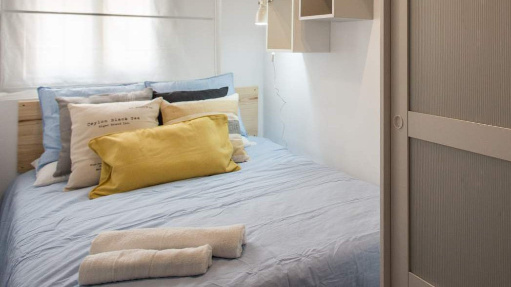 ¡La mezcla perfecta de un lugar tranquilo pero luminoso donde descansar la encuentras con esta habitación! Esta practica y super chula opción tiene un diseño moderno, juvenil y único en el piso, decorada con tonos blancos y toques de color vino que la hacen muy atractiva a la vista. Vas a disfrutar de tu estadía en esta bonita opción, ya que hay una especie de dos zonas diferenciadas, la primera es la zona de descanso, con la cama doble super confortable con ropa de cama, almohadas, cojines extra, armario y estanterías en la parte mas luminosa de la habitación para despertar con frescura cada mañana. Y la segunda zona es la de relajo o estudio, en donde hay una cómoda butaca con reposapiés, mesita y lampara para poder disfrutar de un buen libro, música o lo que prefieras; también en esta zona tiene un escritorio individual abatible con lampara de estudio, estanterías y silla de escritorio.