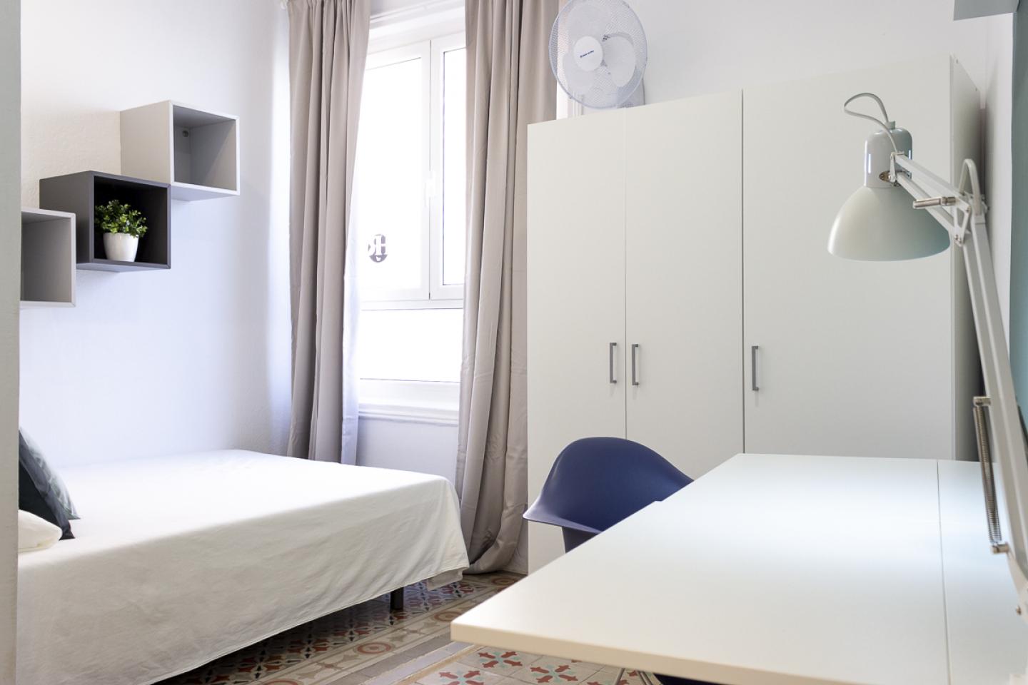 ¡Una de las habitaciones principales del piso es esta! Muy luminosa, amplia, perfectamente distribuida y con todo lo que necesitas para disfrutar de tu estadía en Barcelona. Esta moderna y super chula habitación tiene un aspecto super fresco y juvenil, con tonos blancos y verdes dentro que la llenan de energía positiva para reactivarte cada mañana. Tiene un diseño perfecto, pensado para aprovechar cada espacio eficientemente y te sientas a gusto en ella. Dispone de una cama doble super con ropa de cama, almohadas y cojines extra que la hacen más confortable y ubicada además frente a la ventana por donde ingresa mucha luz natural durante el día; tiene también algunas estanterías, un amplio armario, ventilador, un escritorio doble abatible con lampara de estudio, silla de escritorio, una zona de relajo con butaca, lampara y reposapiés; un espejo y zapatero también.