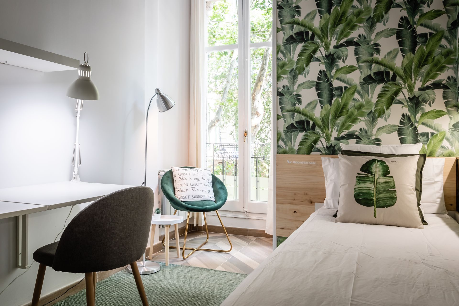 Esta fantástica habitación, es bastante amplia, con un extra de luminosidad y frescura por sus tonos blancos. Tiene un estilo nórdico, fresco y moderno; además de contar con una terraza semiprivada compartida con la habitación de al lado. Esta terraza es la cereza del pastel de esta habitación, ya que podrás disfrutar de unas preciosas vistas al parque de la Ciutadella y a los árboles verdes que te brindaran una tranquilidad única. La habitación dispone de cama doble, amplio escritorio doble abatible, silla de escritorio, un espacio de confort con butacas y reposapiés, armario, cómoda y espejo. Además de todo lo necesario para entrar a vivir, como sábanas, ropa de cama y almohadas.