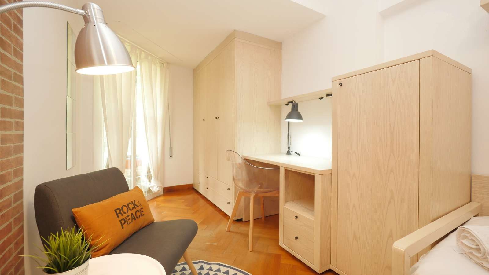 Exclusiva habitación, extendida, súper luminosa y con un diseño espectacular. Tiene salida a una terraza semiprivada compartida con la habitación contigua, en la que podrás disfrutar con preciosas vistas al parque de la Ciutadella y al Zoo de Barcelona. Lo fabuloso de esta habitación es que tienes tu propia “chill zone” en la habitación, además de geniales vistas hacia árboles verdes y el Zoo de Barcelona. Cuenta con cama individual, un espacio de confort muy amplio con reposapiés y una butaca de estilo industrial que contrasta con el estilo moderno y nórdico de la habitación, un escritorio amplio y la silla del escritorio, estanterías, lámparas, y un enorme armario.