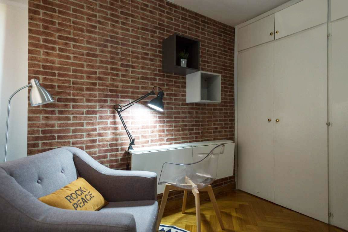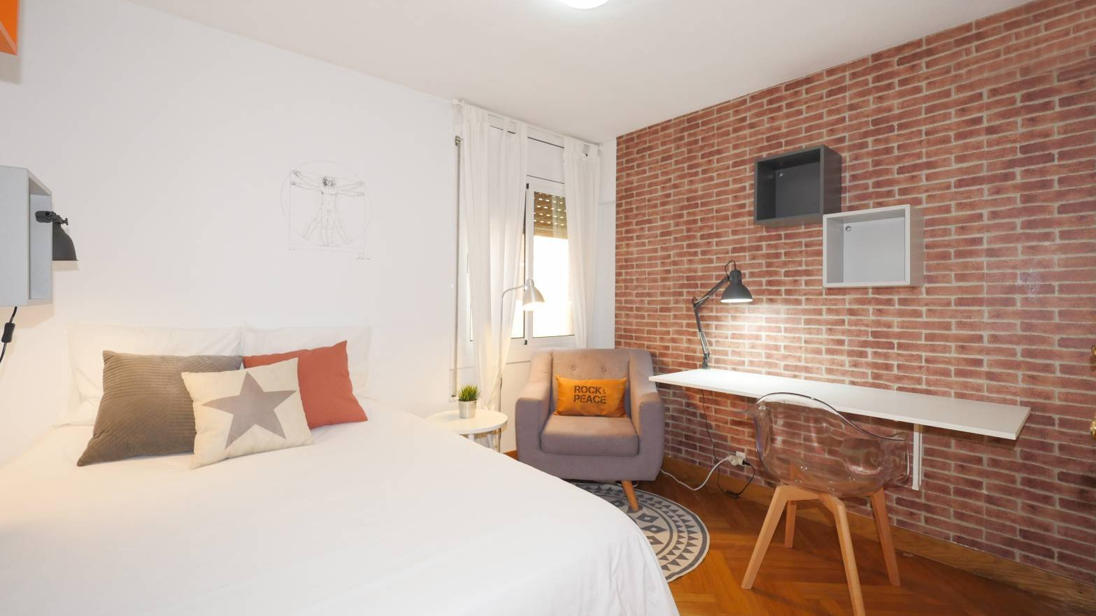 Esta espaciosa habitación es muy tranquila, bonita y también luminosa. Con un diseño fantástico industrial y moderno a la vez; se encuentra en la parte interior del piso, lo cual la hace más tranquila y puedas relajarte al máximo en la tranquilidad de tu propio espacio para estudiar o trabajar. Lo más guay de esta habitación es que tiene un gran armario empotrado, súper espacioso en el cual tendrás espacio de sobra para guardas todas tus cosas, además de tener una cama doble súper cómoda, estanterías, lámparas, escritorio doble abatible, una butaca, mesita y reposapiés, para esas tardes de relax, leyendo un libro o viendo tus series favoritas en la privacidad de tu habitación.