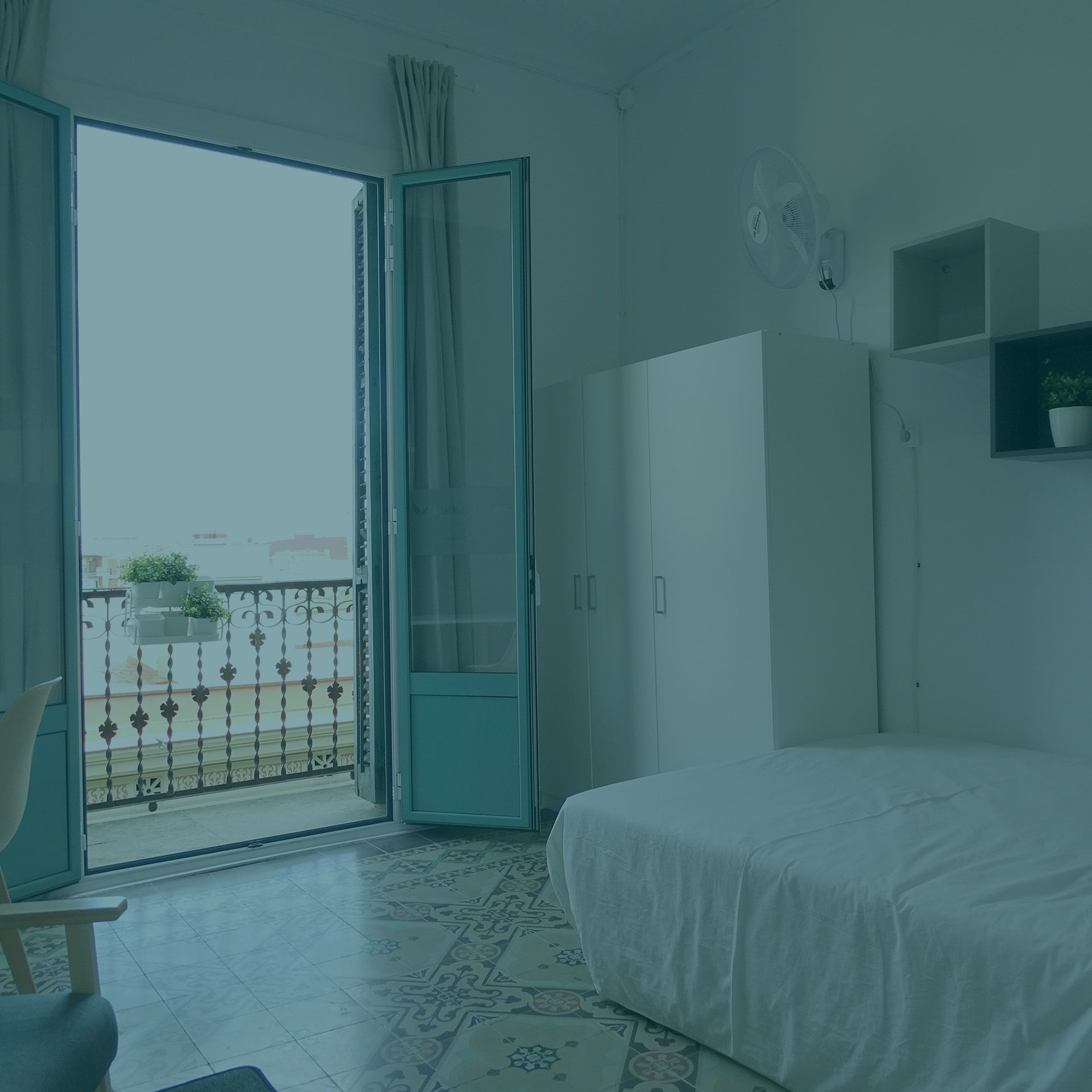 Esta super chula habitación tiene una distribución perfecta con un diseño acogedor y funcional. Está equipada completamente con todo lo necesario para que simplemente disfrutes de tu estadía y experiencia en esta preciosa ciudad. Lo mejor es que la habitación es super luminosa y tranquila, perfecta para descansar muy bien después de una larga jornada de estudio o trabajo. Dispone de una cama doble, con sábana, nórdico, almohadas y cojines extras para un mayor confort, tiene también algunas estanterías, escritorio individual abatible con lámpara de estudio, silla de escritorio, ventilador, espejo, zapateros, armario y una pequeña zona de relajo con butaca, reposapiés y mesita.