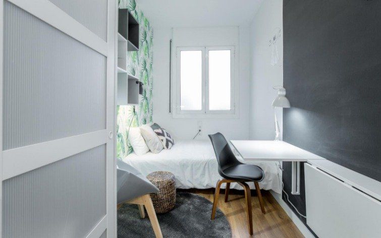¡Ponle atención a esta habitación! Muy luminosa, amplia, perfectamente distribuida y con todo lo que necesitas para disfrutar de tu estadía en Barcelona. Esta moderna y super chula habitación tiene un aspecto super fresco y juvenil, con tonos blancos y contrastes oscuros que la llenan de energía positiva para reactivarte cada mañana. Tiene un diseño perfecto, pensado para aprovechar cada espacio eficientemente y te sientas a gusto en ella. Dispone de una cama doble con ropa de cama, almohadas y cojines extra que la hacen más confortable, y ubicada además frente a la ventana por donde ingresa mucha luz natural durante el día; tiene también algunas estanterías, un amplio armario, ventilador, un escritorio doble abatible con lampara de estudio, silla de escritorio, una zona de relajo con sillón, lámpara y reposapiés; un espejo y zapatero.