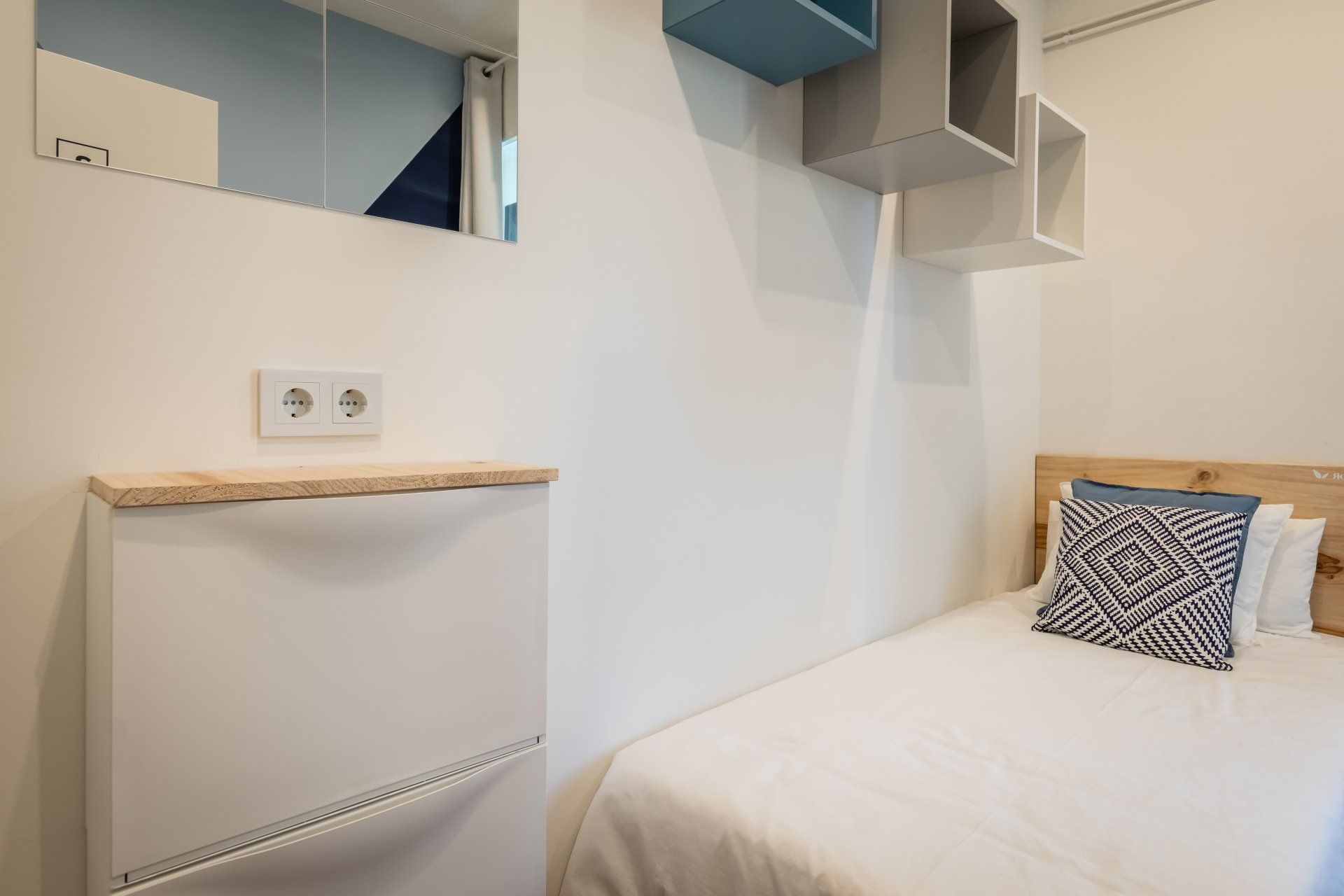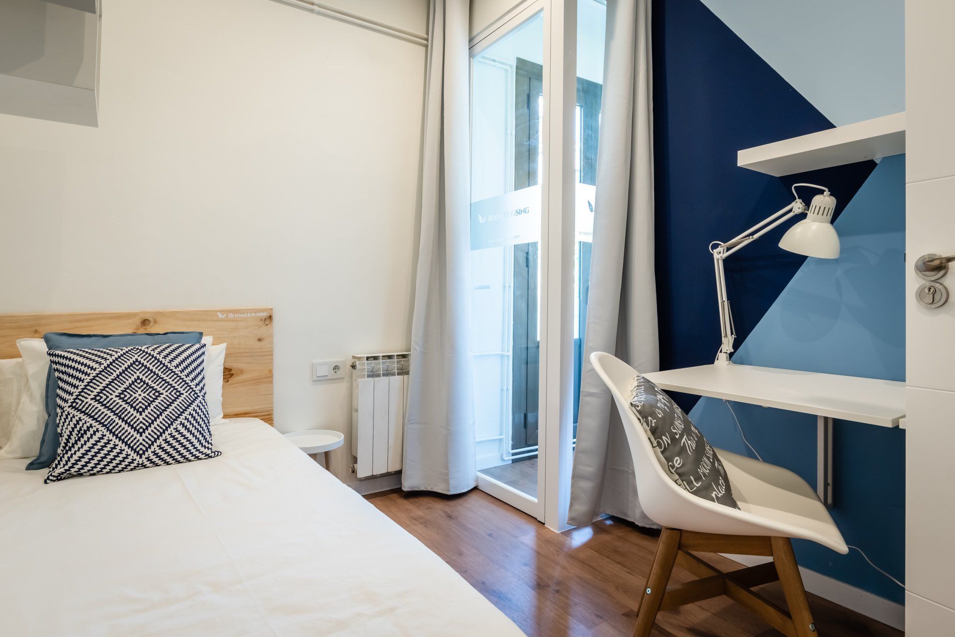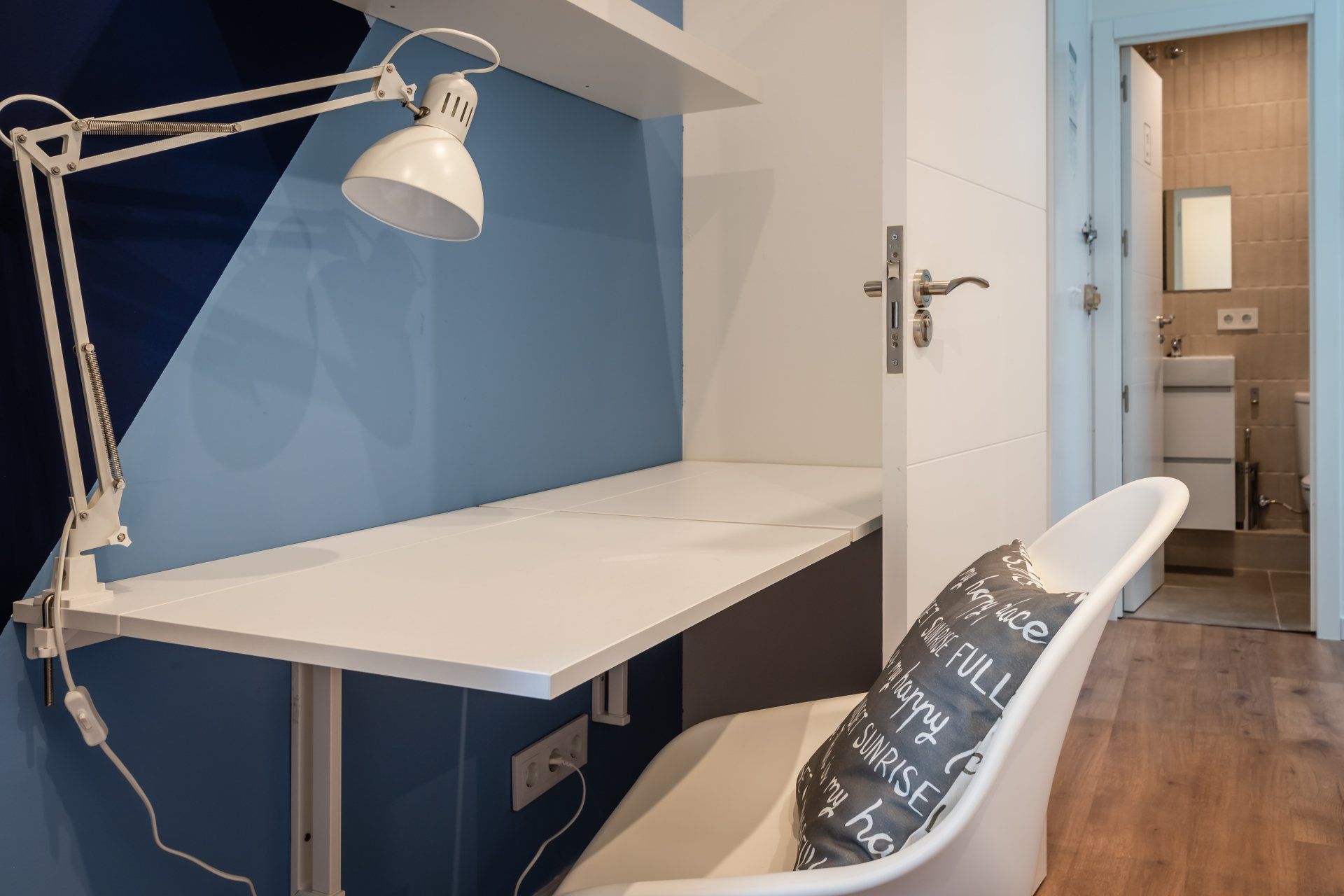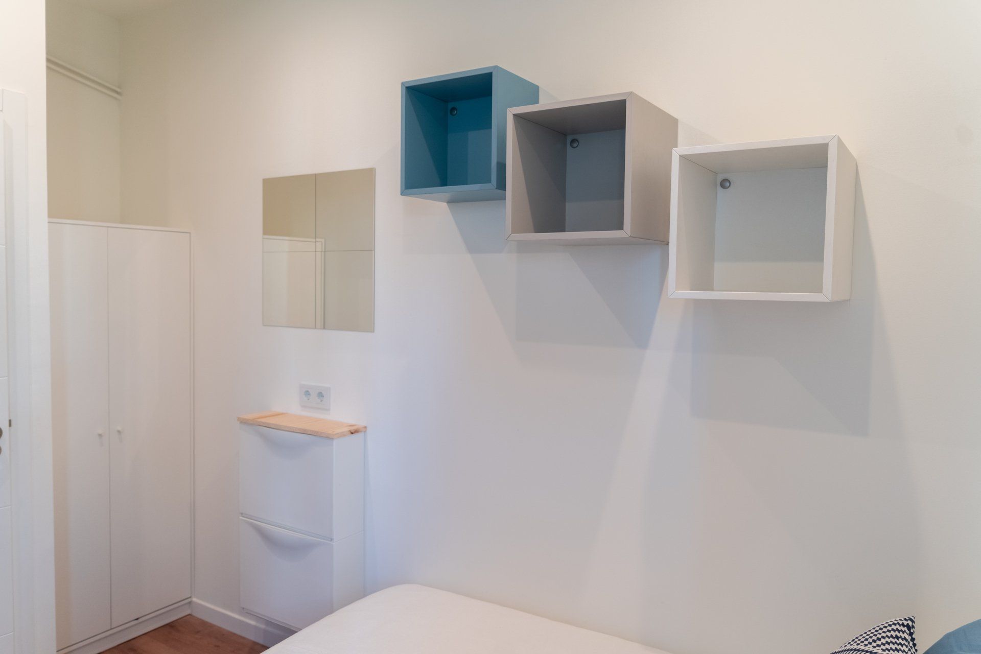 ¡Esta mediana y practica habitación te va a encantar! Es extra luminosa y con un diseño único, compacto, moderno y funcional con todo lo que necesitas dentro de tu habitación. Está decorada con tonos claros y una pared en colores azules lo cual le da un contraste exquisito y sofisticado, ideal para amantes de un buen decorado en su propio espacio. Lo mejor de esta habitación es que es super luminosa y tiene acceso a un balcón. La habitación dispone de una cama individual confortable con ropa de cama, algunas estanterías, espejo, zapatero, un escritorio individual abatible con lampara de estudio, silla y armario.