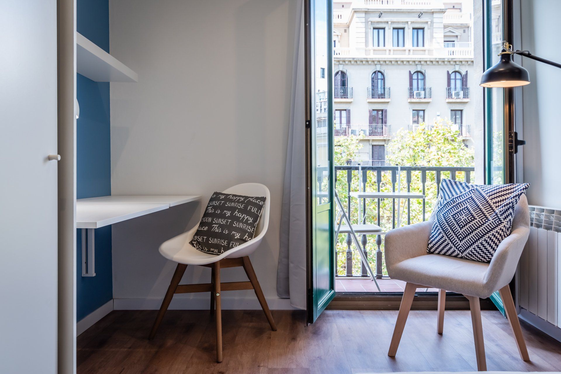 ¡Esta mediana y práctica habitación te va a encantar! Es extra luminosa y con un diseño único, compacto, moderno y funcional con todo lo que necesitas dentro de tu habitación. Está decorada con tonos claros y una pared en colores azules lo cual le da un contraste exquisito y sofisticado, ideal para amantes de un buen decorado en su propio espacio. Lo mejor de esta habitación es que es super luminosa y tiene acceso a un balcón donde podrás salir a tomar una taza de café, una birra y disfrutar de un precioso atardecer en la ciudad Condal. La habitación dispone de una cama doble confortable con ropa de cama, algunas estanterías, espejo, zapatero, un escritorio individual abatible con lampara de estudio, silla y armario.