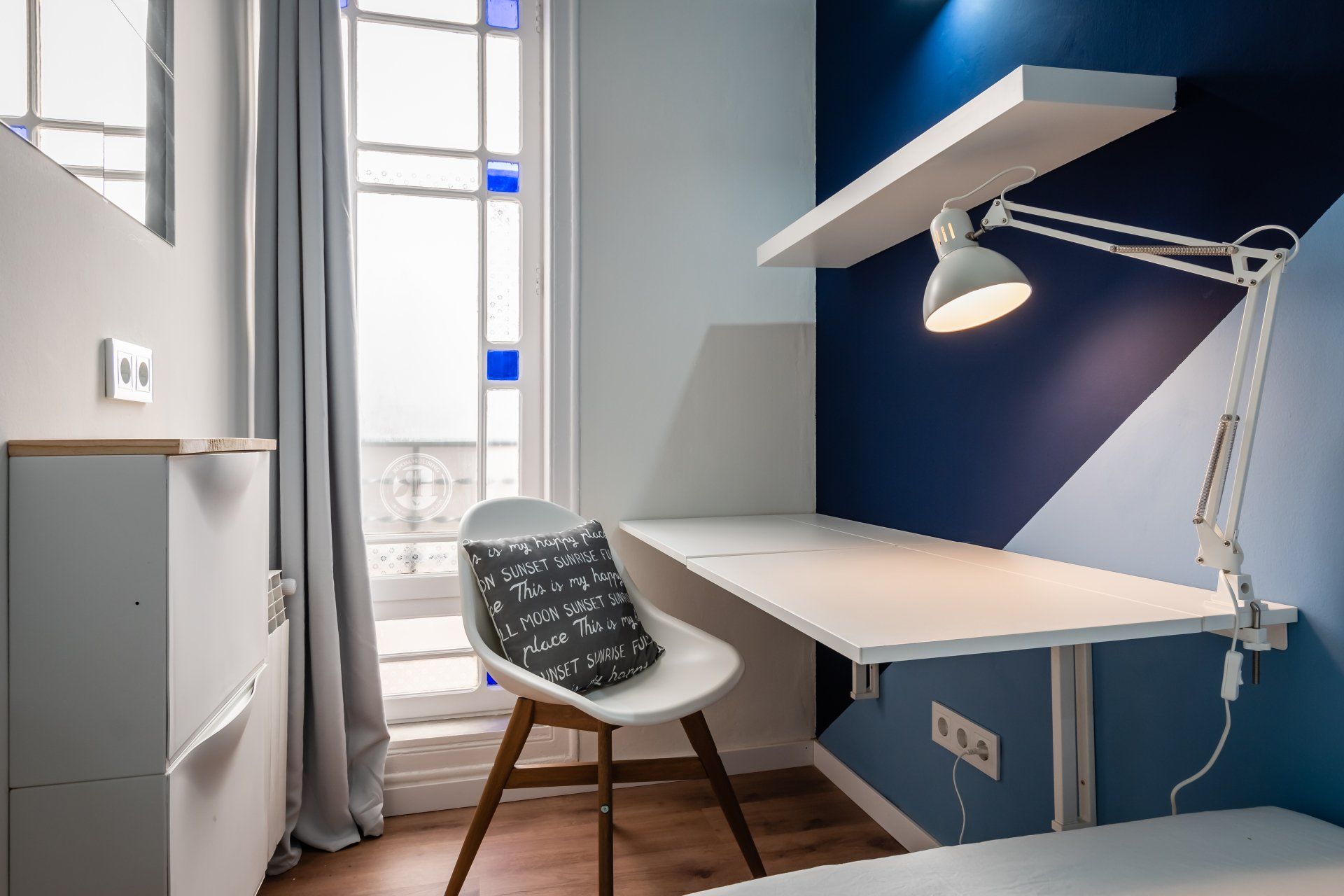 ¡Esta mediana y practica habitación te va a encantar! Es extra luminosa y con un diseño único, compacto, moderno y funcional con todo lo que necesitas dentro de tu habitación. Está decorada con tonos claros y una pared en color vino lo cual le da un contraste exquisito y sofisticado, ideal para amantes de un buen decorado en su propio espacio. La habitación dispone de una cama individual confortable con ropa de cama, algunas estanterías, espejo, zapatero, un escritorio individual abatible con lampara de estudio, silla y armario.
