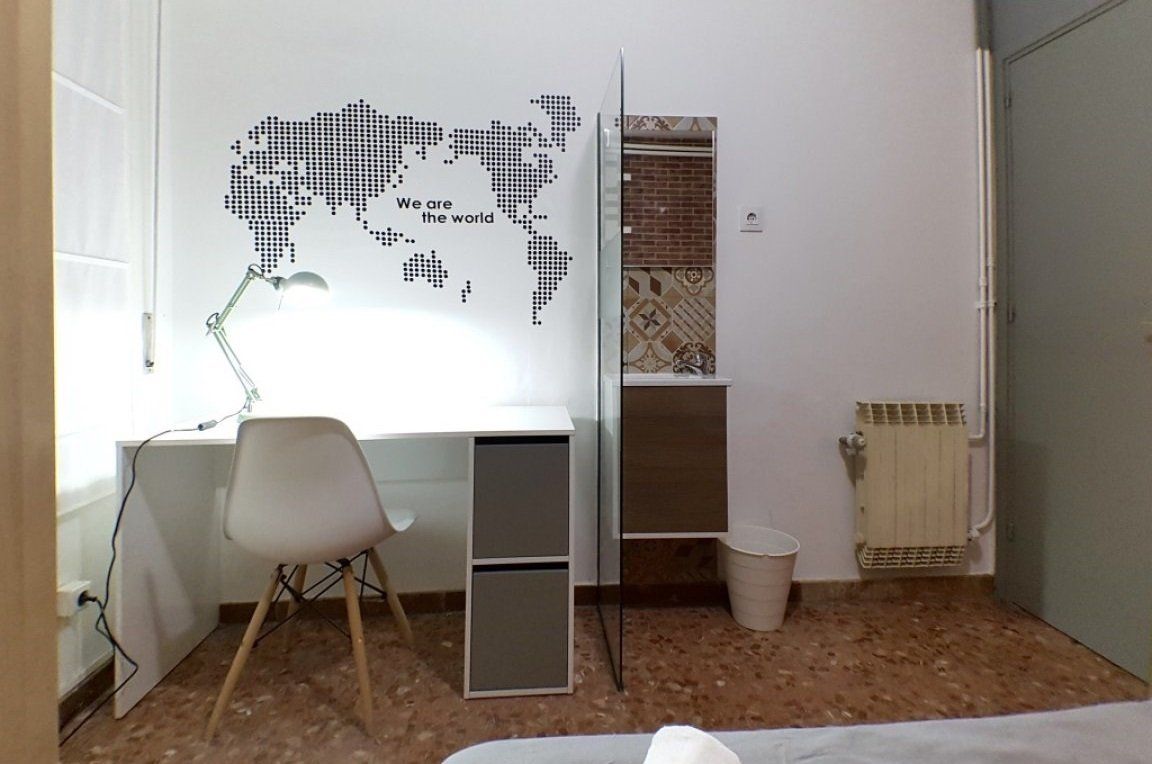 ¡Esta habitación es de las más tranquilas! Se trata de una habitación interior que da hacia un patio de luces interior. Esta habitación será tu sitio ideal si lo que buscas es tener un espacio tranquilo, sin el ruido de la calle, para poder concentrarte mejor si tienes que estudiar para tus exámenes o si lo que necesitas es un espacio donde puedas relajarte tranquilamente después de una larga jornada de trabajo =). La habitación cuenta con cama doble, equipada con almohadas y cojines, además de ropa de cama; un amplio escritorio con lampara de estudio y silla de escritorio; armario, estanterías, espejo y lavamanos dentro de la habitación.