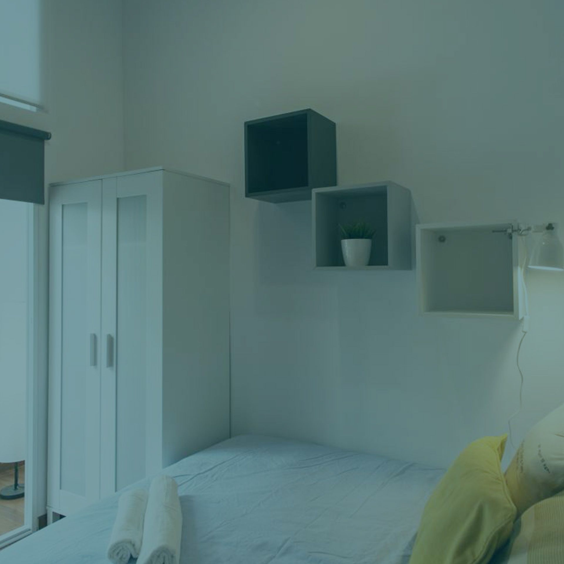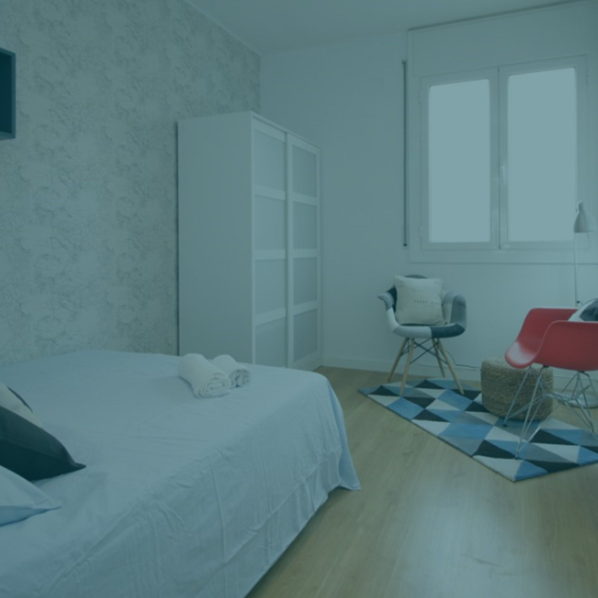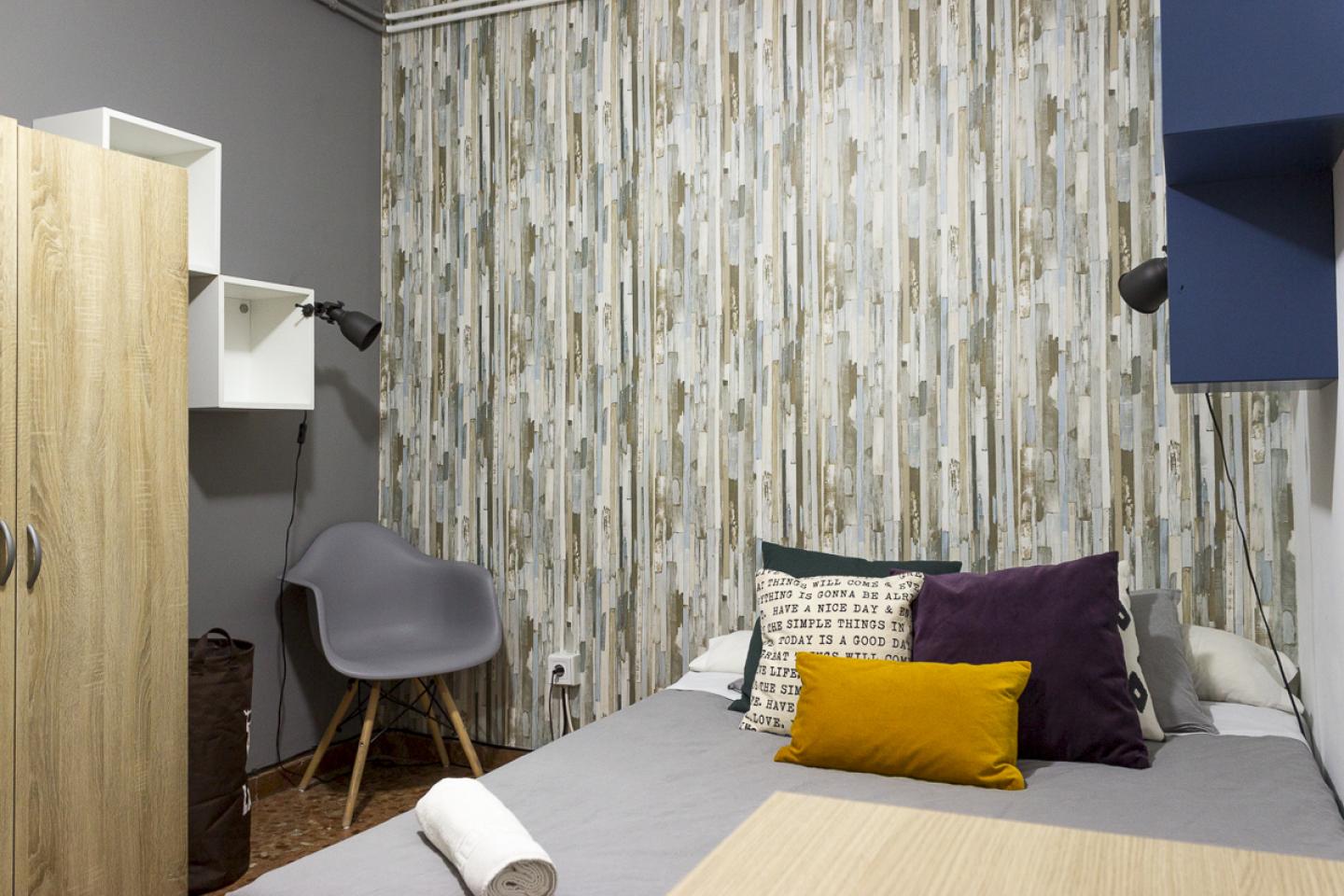 Súper chula habitación con un diseño espectacular y con un estilo nórdico, moderno y acogedor. La habitación está perfectamente bien distribuida, para que en cada rincón de ella se encuentre todo lo que necesitas para vivir. La habitación es interior y tiene una ventana de cara a un patio de luces, súper tranquila y cómoda. Dispone de una cama doble con varias almohadas para darle ese toque de comodidad adicional, además de tener ropa de cama y sabanas. También tiene armarios con un estilo nórdico que contrasta con la frescura de la habitación, además de contar con espejo, lavamanos, silla de escritorio, lámparas, butaca y estanterías.