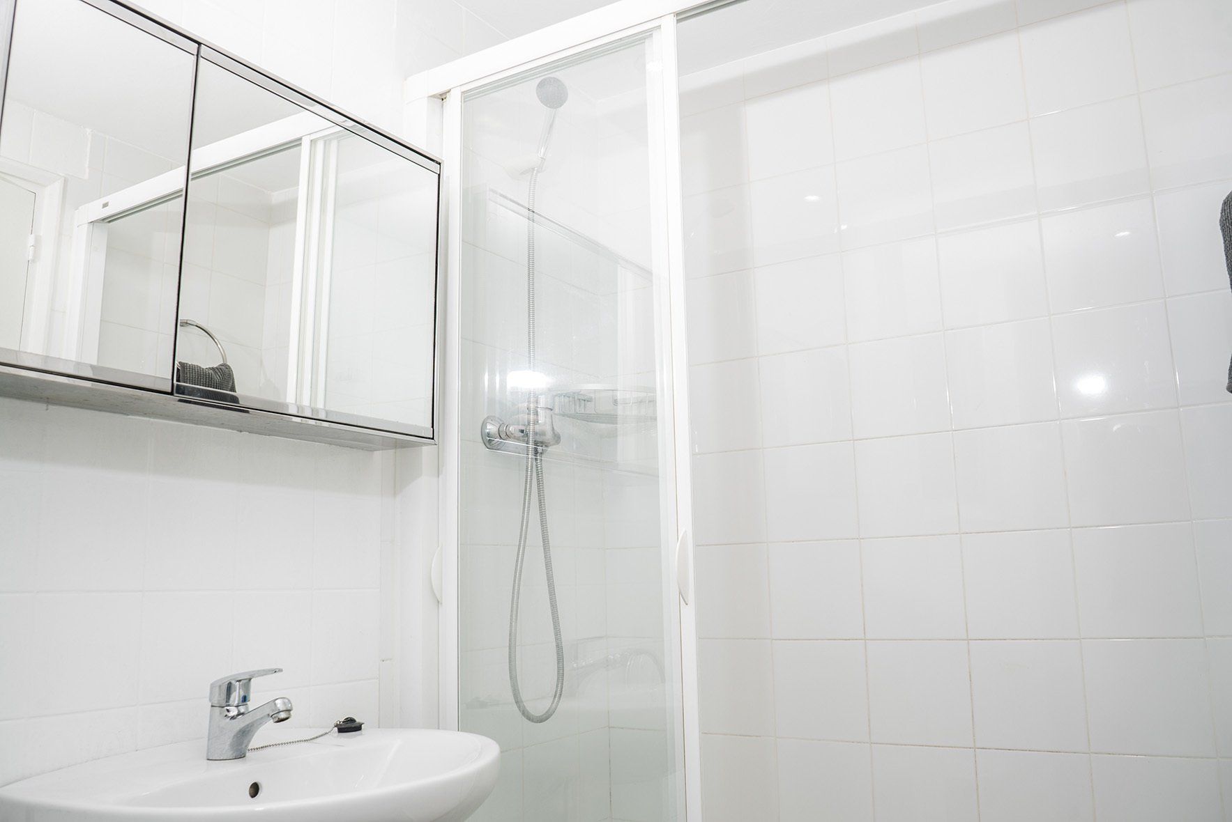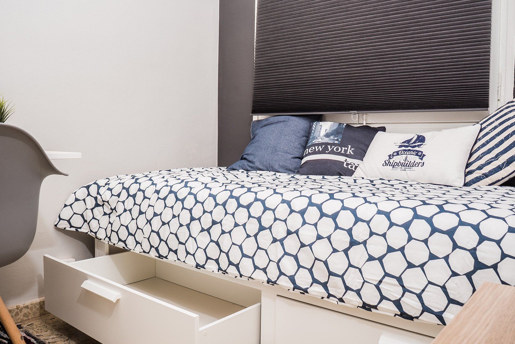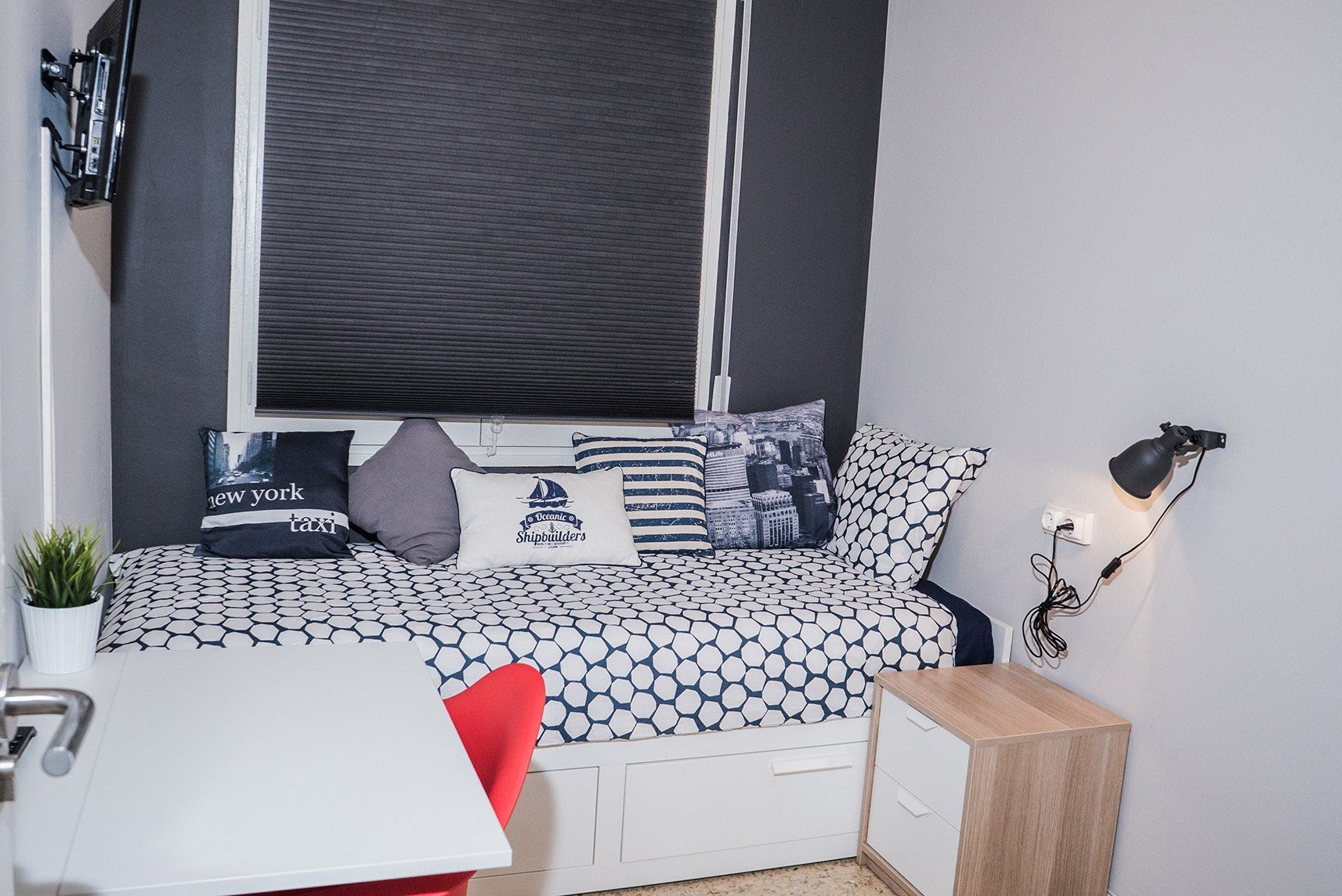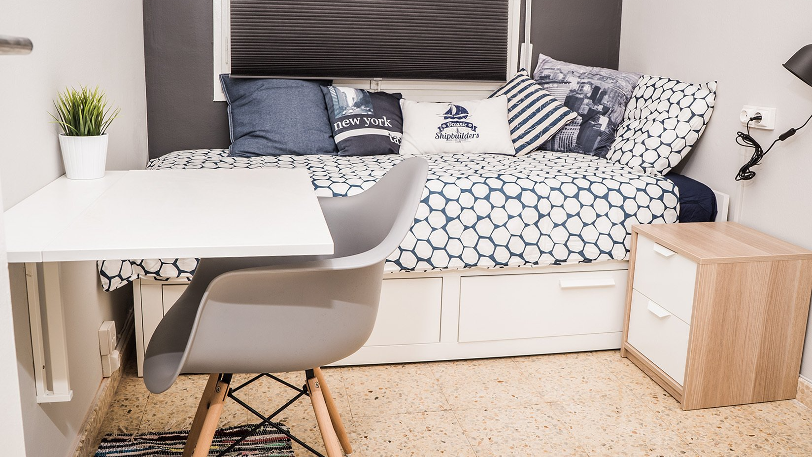 Esta es una de nuestras habitaciones medianas más chulas que tenemos y bien ubicadas, además. La habitación tiene un diseño muy guapo, con un estilo fresco y moderno por sus tonos blancos predominantes y toques grises. La habitación es bastante tranquila ya que es interior, pues tiene una ventana que da a un patio de luces interior, por ello es perfecta si lo que necesitas es un espacio tranquilo para poder estudiar, relajarte o descansar. Cuenta con una cama individual extensible con ropa de cama, escritorio individual, silla de escritorio, una mesita de noche, ¡armario y además tiene una TV dentro de la habitación que da directamente hacia la cama, para que puedas relajarte mientras ves tus series favoritas online!
