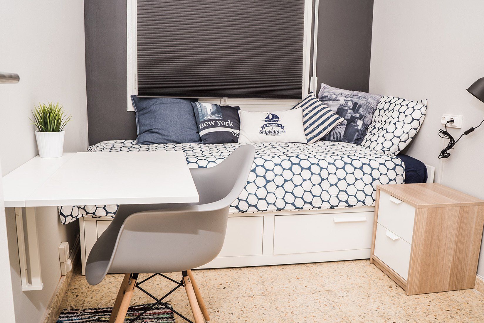 Para quien busca una habitación tranquila y acogedora, además de estar en un piso muy bien ubicado, esta habitación es la opción perfecta. Esta bonita y compacta habitación es ideal si lo que necesitas es mayor tranquilidad, pues al ser una habitación interior, garantizara eso y más. La decoración de esta habitación que incorpora colores blancos y oscuros, hacen que haya un contraste agradable a la vista. Cuenta con una ventana interior que da hacia un patio de luces; además está completamente equipada con una confortable cama individual extensible con un colchón super cómodo equipada con ropa de cama, almohadas y cojines, también un escritorio individual abatible, armario, estanterías, mesita de noche y tu propia TV, para que no te pierdas un solo capítulo de tu serie favorita.
