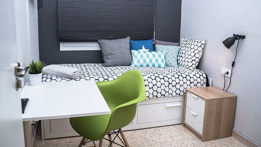 Esta habitación interior será tu mejor opción si lo que necesitas es un espacio tranquilo para descansar, trabajar y/o estudiar. Ideal para concentrarte ya que al ser una habitación interior el ruido es casi imperceptible. Esta magnífica habitación cuenta con diseño super guay con un estilo moderno y minimalista. Lo mejor de esta habitación es la cama que tiene que está ubicada con la TV en frente para que te relajes mientras miras algunos capítulos de tu serie favorita. Además, que la cama es super confortable ya que tiene un colchón super cómodo y extensible también, por si necesitas un espacio extra en la cama para ti o alguna visita. La habitación viene con ropa de cama, almohadas y cojines, además de una mesita de noche, escritorio individual abatible, silla de escritorio, lámpara de estudio y armario.