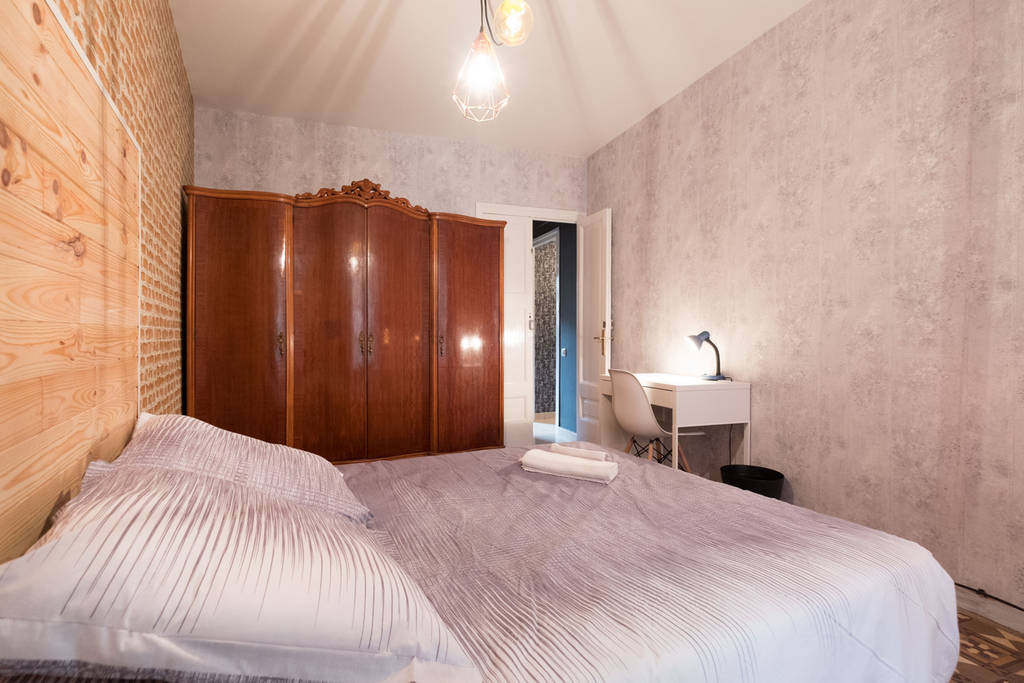 Sin duda, esta es una habitación estupenda también, con características muy similares a sus hermanas en este fantástico piso. Esta amplia y preciosa habitación es ideal si lo que buscas es una habitación espaciosa que tenga todo lo necesario para que comiences una nueva experiencia en Barcelona. Lo mejor de esta habitación es que es exterior, y tienes opción de dejar entrar luz natural a tu habitación durante el día y por las noches cubrir las ventanas y de esta forma tener una habitación con poca luz para poder descansar sin problemas durante la noche. Tienes acceso a un pequeño balcón que da hacia un callejón, pero donde no pasan coches, entonces es super tranquilo. La habitación cuenta con una cama doble super confortable, chula y equipada con ropa de cama; además de un armario super amplio, escritorio con lampara de estudio, silla, dos butacas y una pequeña mesita.