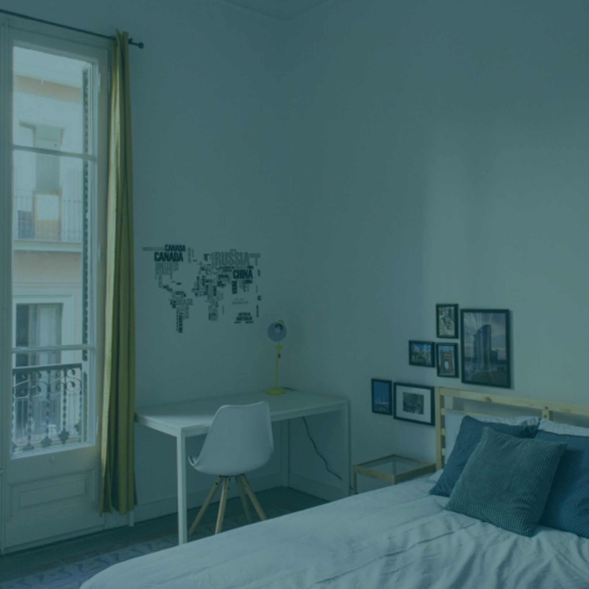 Habitación acogedora con un diseño super bonito. Esta habitación tiene un estilo fresco por los tonos que tiene en el interior, con un toque compacto y muy chulo. La habitación es interior, un lugar agradable y genial para descansar. Lo mejor de esta habitación es que es interior, así que es super tranquila, ubicada en el barrio de Gracia, el cual es genial para gente joven. Tiene una cama doble super cómoda, pensada para tu confort, equipada con todo lo necesario como nórdico, sábana, almohadas y cojines extra. Tienes también dentro un escritorio con lampara de estudio, silla, una mesita de noche y un armario abierto.