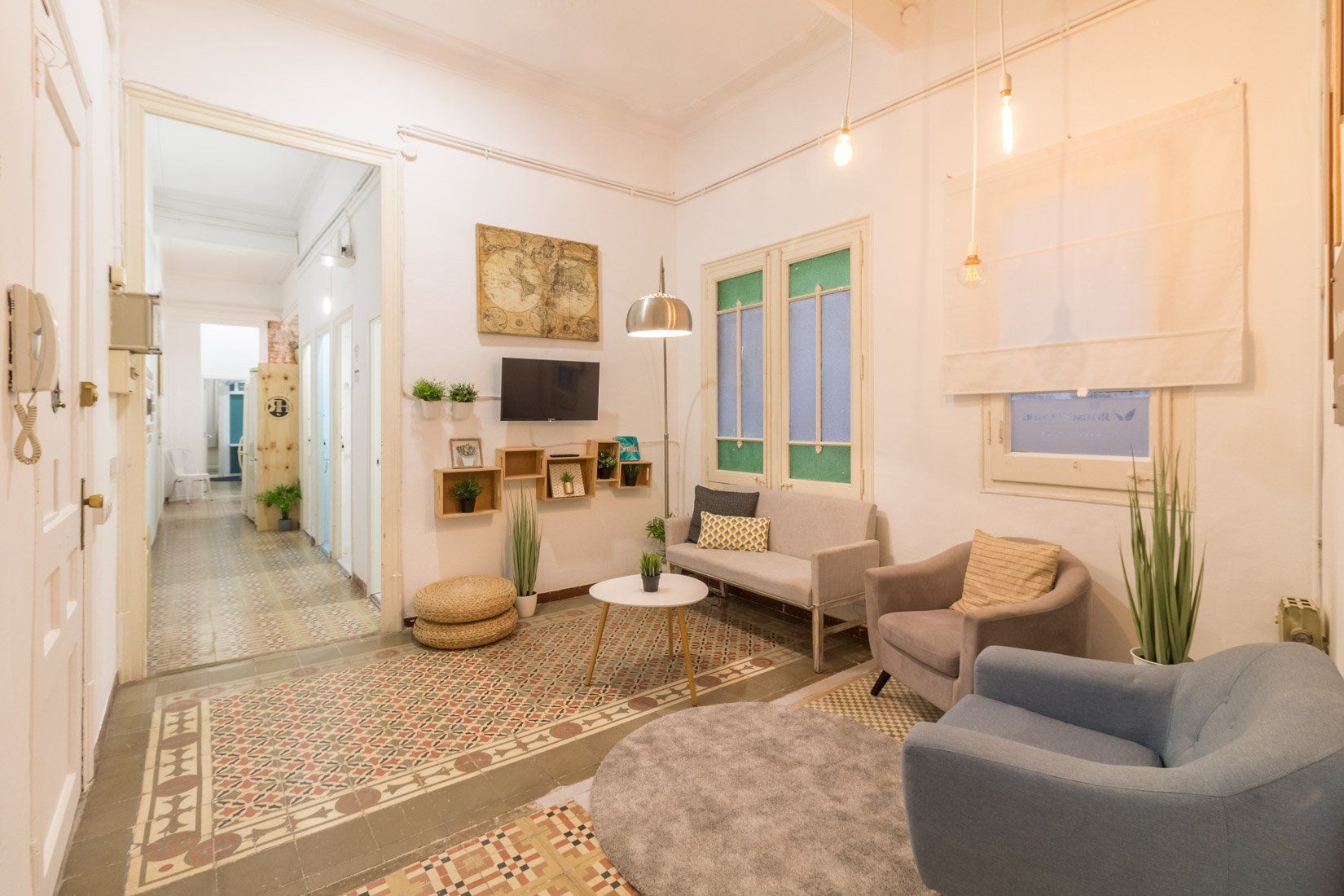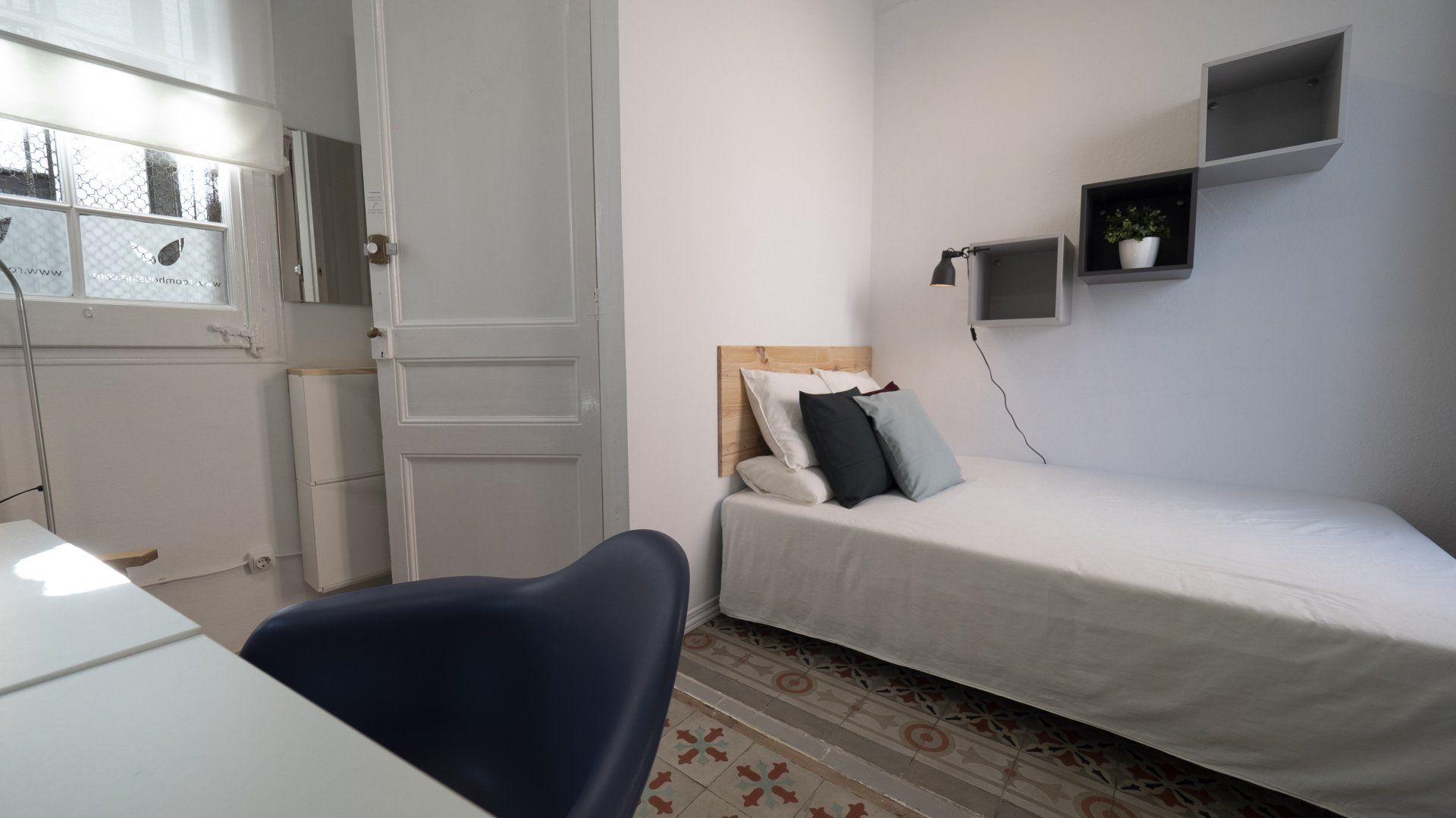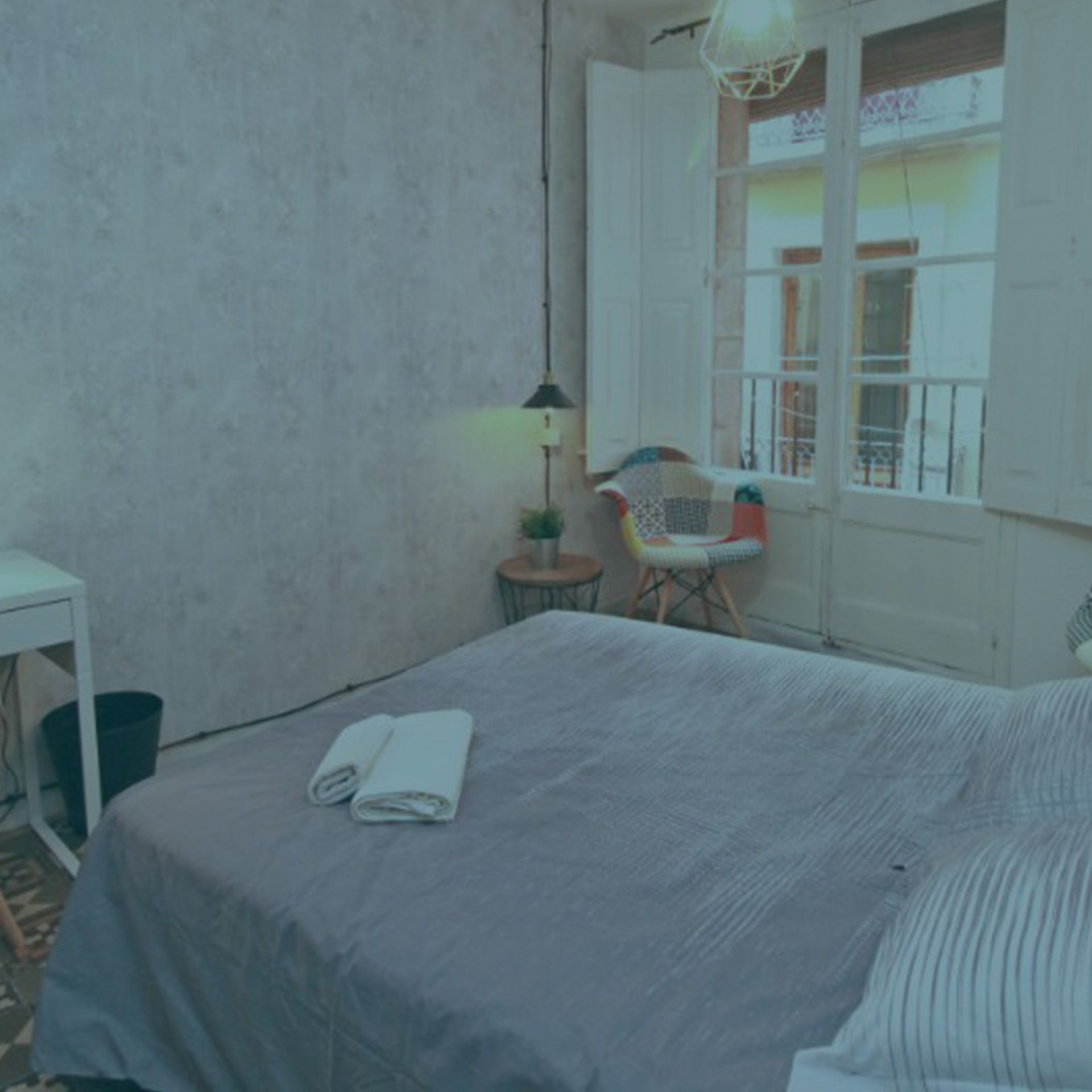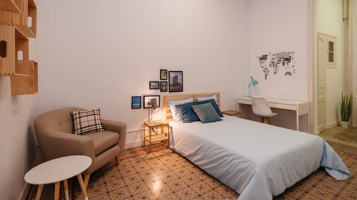 Habitación acogedora con un diseño super bonito. Esta habitación grande tiene un estilo fresco por los tonos que tiene en el interior, con un toque compacto y muy chulo. La habitación es interior y tiene una chill out para hacer de tu espacio personal un lugar agradable y genial para descansar. Lo mejor de esta habitación es que es interior, así que es super tranquila, ubicada en el barrio de Gracia, el cual es genial para gente joven. Tiene una cama doble super cómoda, pensada para tu confort, equipada con todo lo necesario como nórdico, sábana, almohadas y cojines extra. Tienes también dentro un escritorio con ámpara de estudio, silla, una mesita de noche y un armario abierto.